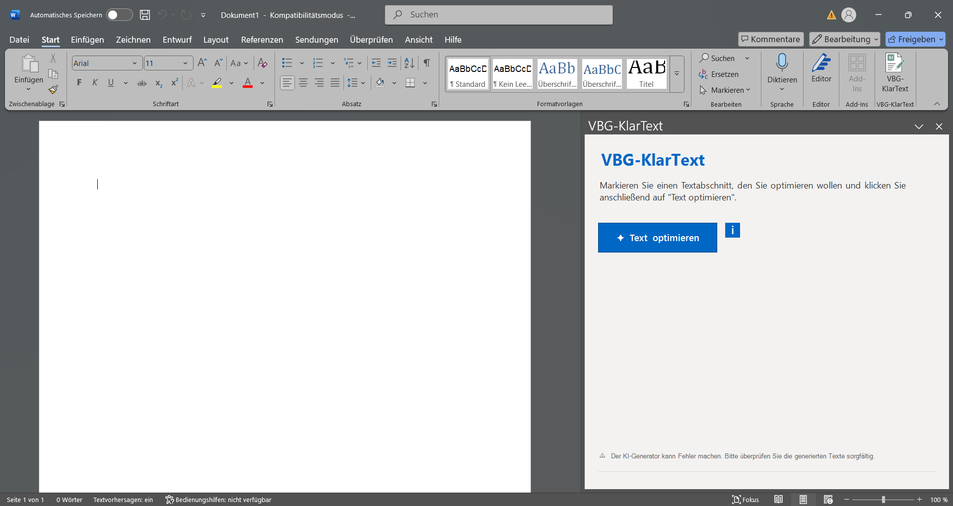 Behörden-KlarText ist direkt in Microsoft Word integriert. Sie können sowohl neue als auch bereits bestehende Dokumente ganz normal in Word öffnen und bearbeiten. Nach dem Öffnen Ihres Dokuments finden Sie das Behörden-KlarText-Symbol in der oberen Menüleiste. Mit einem Klick darauf öffnen Sie das Add-In. Es erscheint auf der rechten Seite Ihres Dokuments in einer Seitenleiste. Von dort aus lassen sich alle wichtigen Funktionen bequem steuern. Um einen Text zu verbessern, markieren Sie einfach den gewünschten Textabschnitt in Ihrem Dokument und klicken anschließend auf den blauen Button „Text optimieren".