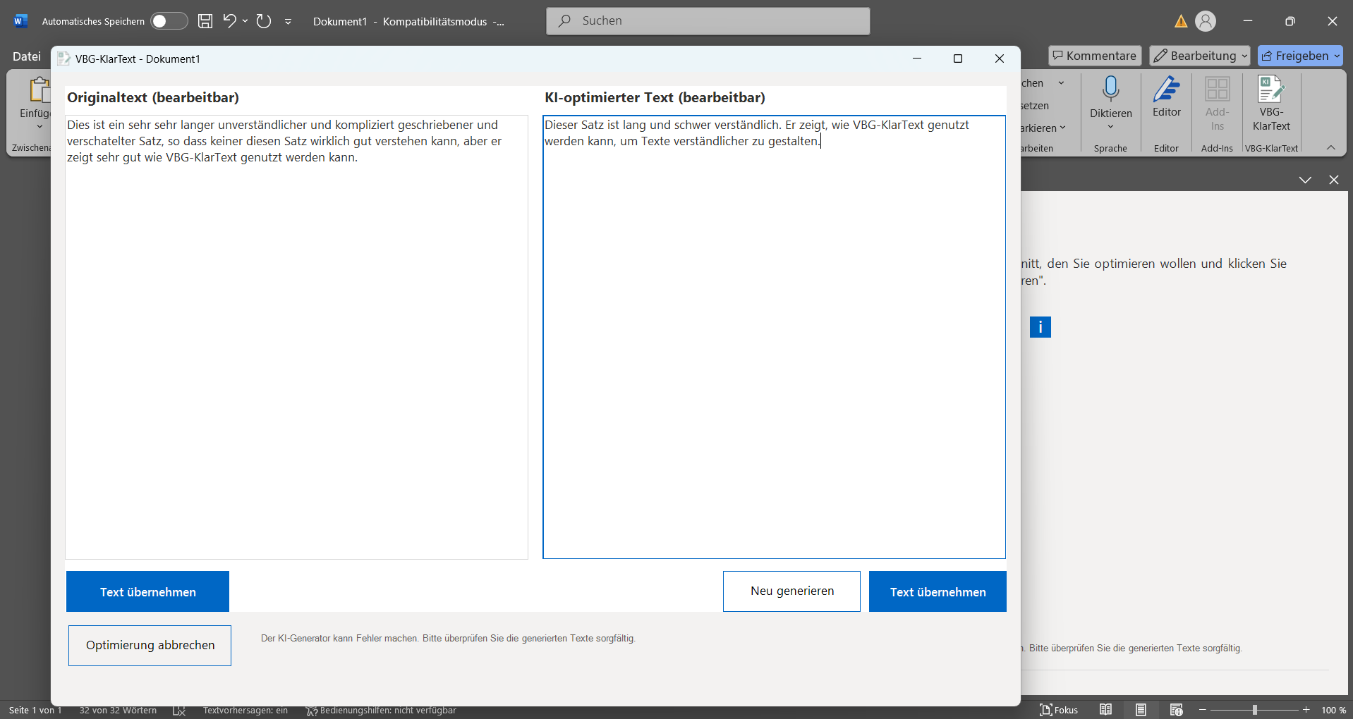 Behörden-KlarText unterstützt Sie bei der sprachlichen Vereinfachung, ersetzt jedoch nicht Ihre fachliche oder rechtliche Prüfung: Die Anwendung ist so eingestellt, dass durch die Optimierung keine inhaltlichen Änderungen vorgenommen werden. Dennoch kann es vorkommen, dass sich die Aussage eines Textes durch die Umformulierung leicht verändert. Bitte prüfen Sie daher alle KI-optimierten Textvorschläge sorgfältig, bevor Sie diese verwenden oder versenden, insbesondere bei rechtlich sensiblen Texten. Verstehen Sie das Tool als hilfreiches Werkzeug, das Ihnen Anregungen für klare und verständliche Formulierungen liefert.