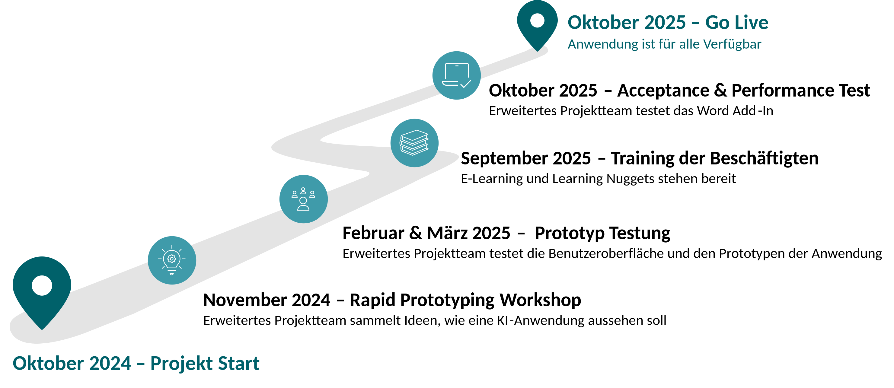 Bereits in der Planungsphase wurde außerdem festgelegt, dass es ein eigenes Teilprojekt für die interne und externe Kommunikation geben soll, um alle Beteiligten gregelmäßig über den Fortschritt des Projektes zu informieren. Zusätzlich wurde eine sogenannte Schadenspotenzialanalyse mit einem breiten Kreis von Beteiligten durchgeführt, um mögliche Risiken frühzeitig zu erkennen. Die Leitlinien empfehlen auch, sich intensiv mit dem Thema Verzerrungen (Bias) in KI-Systemen auseinanderzusetzen, was explizit in die Schulung aufgenommen wurde.